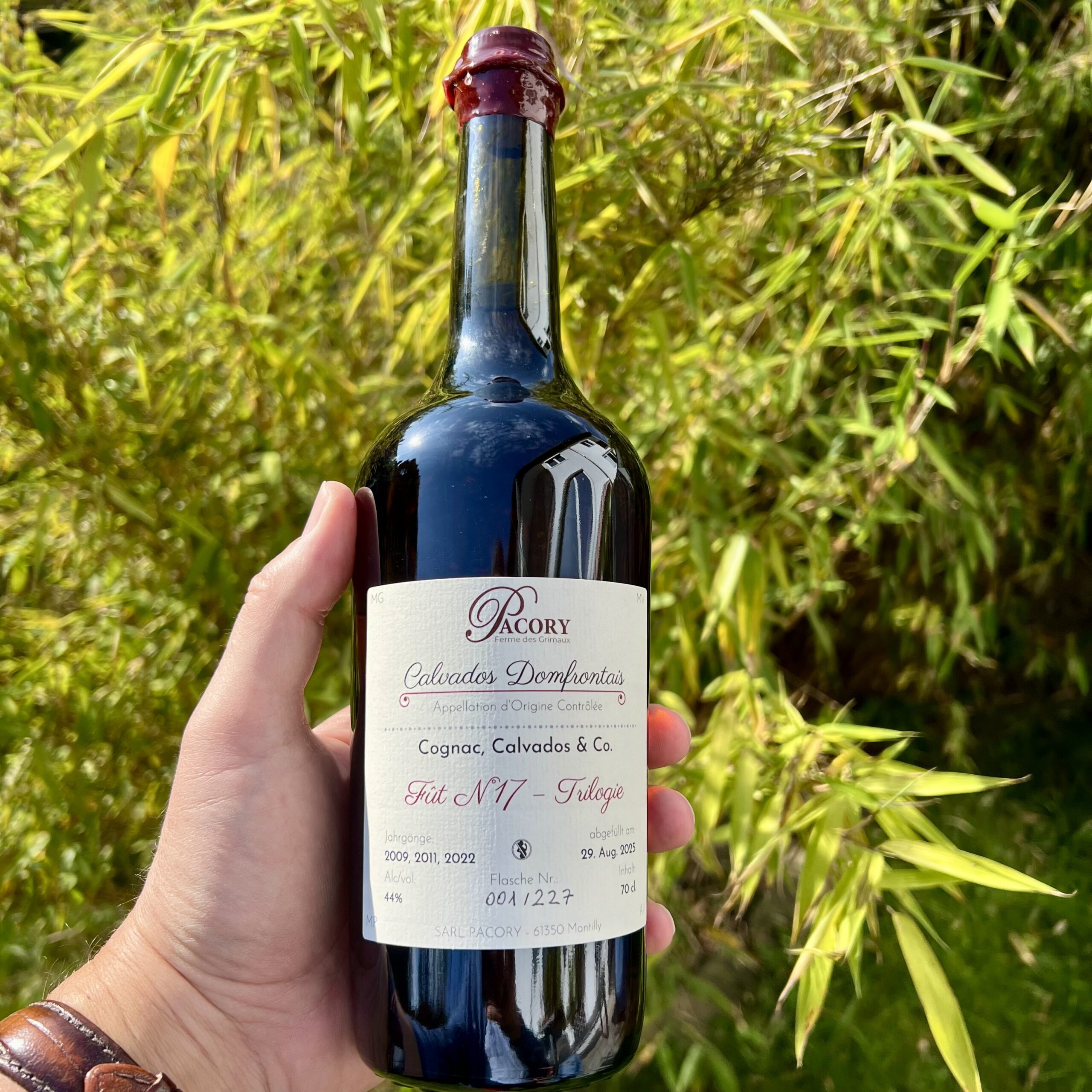 Unser Fass N°17 ist bei dieser Abfüllung bereits 14 Jahre lang im Fass gewesen, allerdings haben wir ihn dieses Mal mit zwei weiteren Bränden von Pacory vermählt. Frédéric hatte uns einige Proben dazu zur Verfügung gestellt. Wir haben unser eigenes kleines Labor hergerichtet und verschiedene Variationen ausprobiert. Wir kannten einzig die Nummer des jeweiligen Fasses, wussten aber nicht aus welchem Jahr der Brand war. Unsere Wahl fiel auf die Fässer mit den Nummern 1 (Jahrgang 2009) und 37 (Jahrgang 2022).
